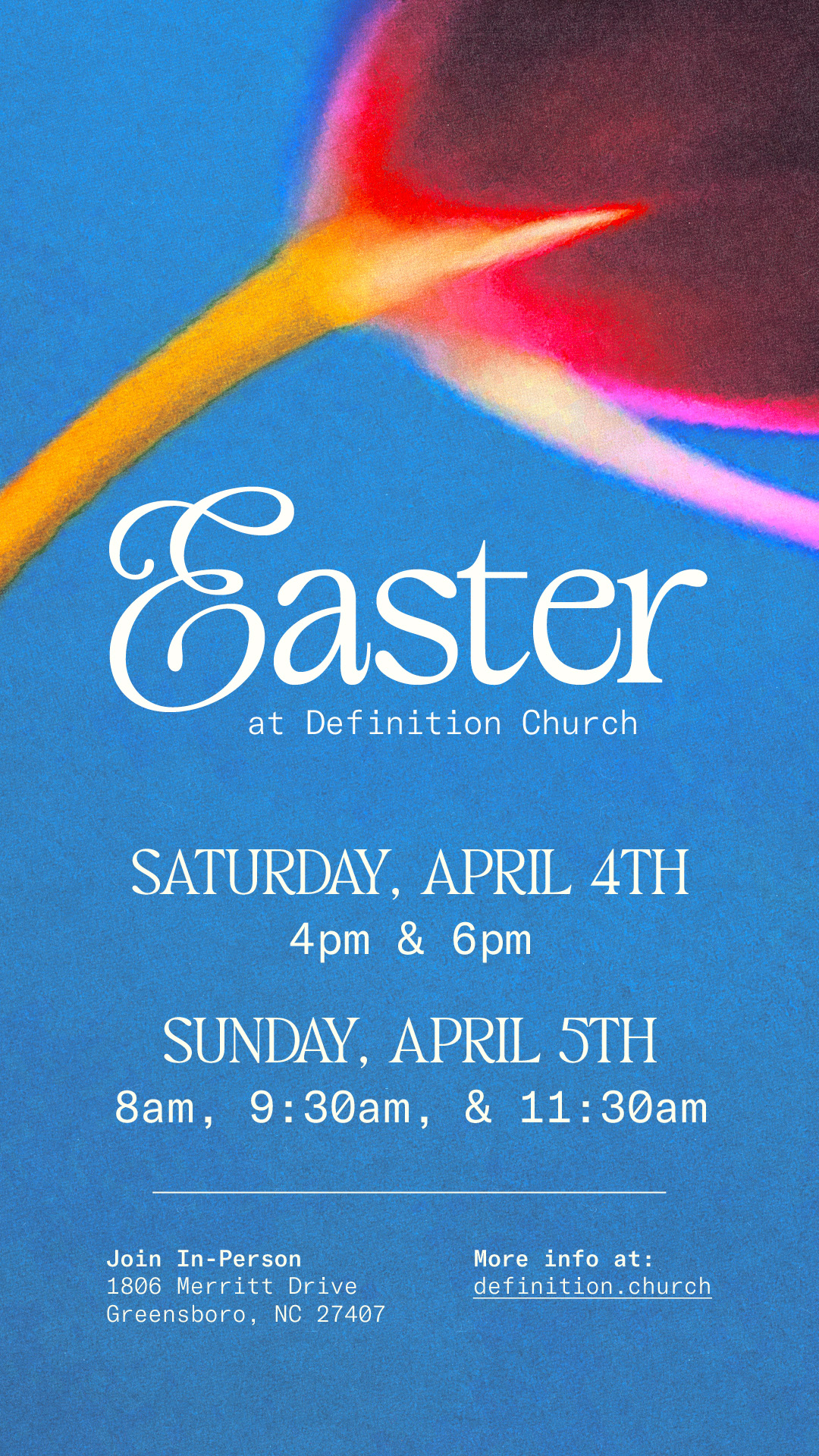 We have experiences on Saturday, April 4th at 4:00pm and 6:00pm and Sunday, April 5th at 8:00am, 9:30am, 11:30am. Join us!